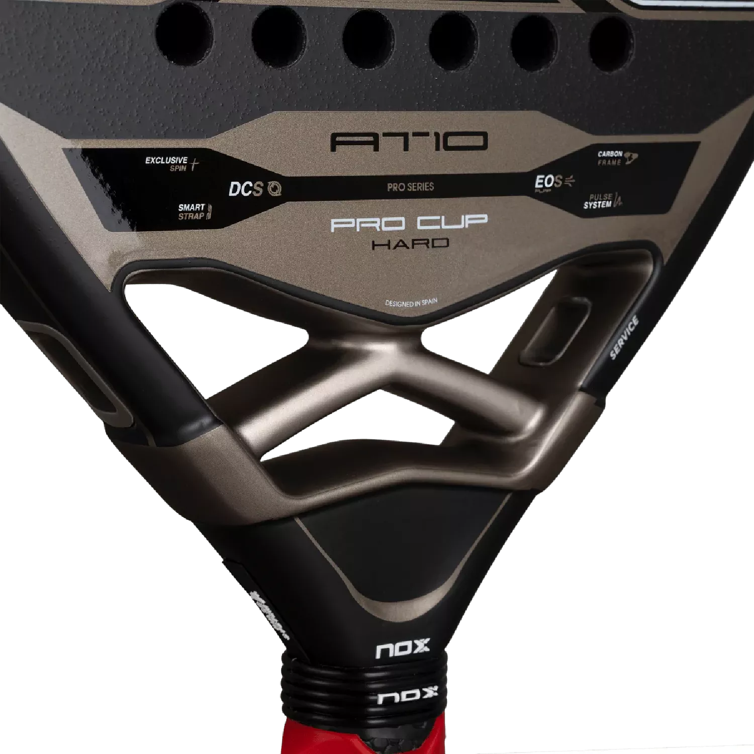 NOX Padel Racket AT10 Pro Cup Hard 2026 (By Agustin Tapia) brings a fresh design to one of NOX’s most iconic rackets while preserving its legendary essence. Now featuring the same mould used by Agustin Tapia in 2025, this model integrates advanced high-performance innovations such as the EOS Flap system, improving aerodynamics and manoeuvrability, and the Pulse System, which minimises vibrations for a more comfortable and stable game.