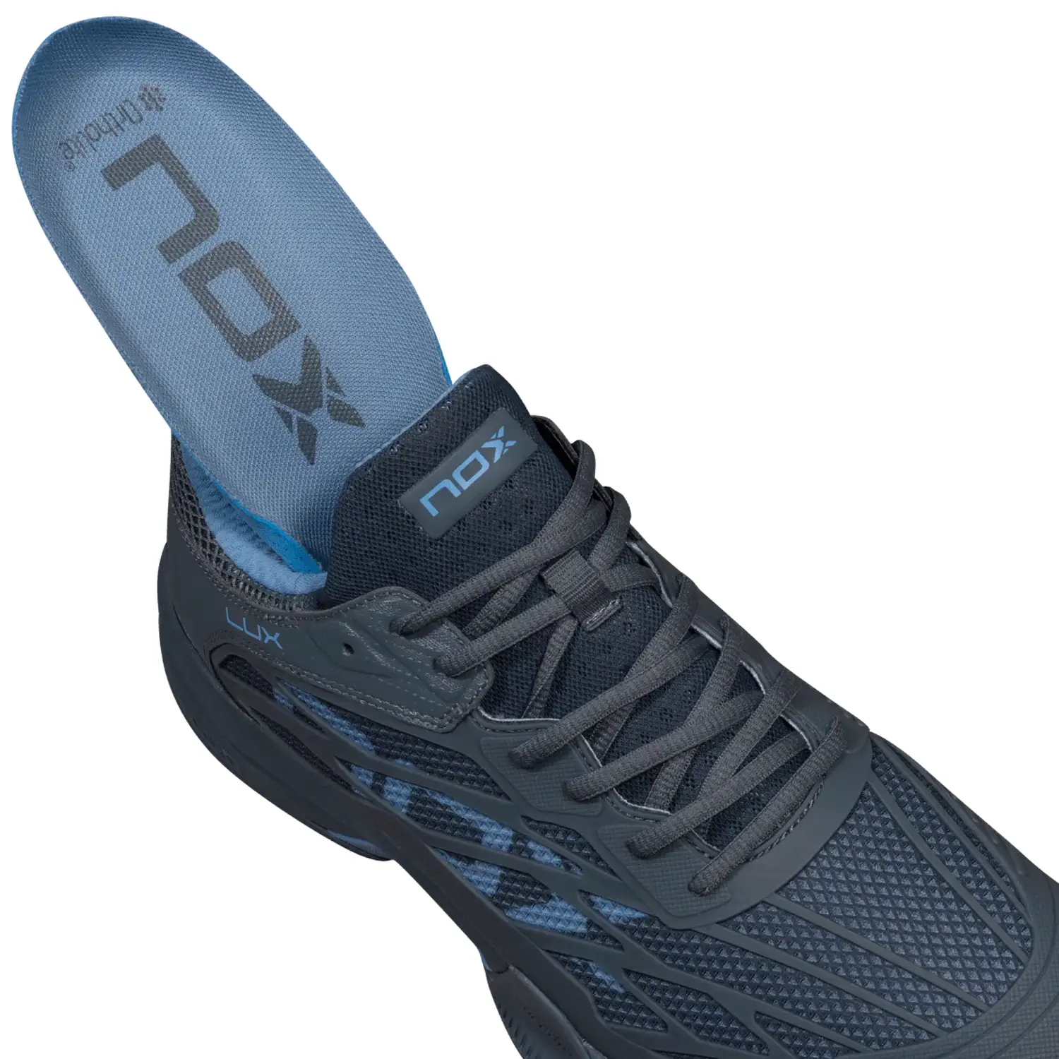 NOX Padel Shoes AT10 LUX Dark Slate are designed for professional and demanding padel players who prioritize both peak performance and long-term joint and muscle health. Certified by the INESCOP Footwear Technology Center and endorsed by podiatry specialists, these shoes are engineered to significantly reduce injury risk while enhancing on-court efficiency. The integration of AGG Technology (Advanced Gravity Geometry) increases the heel-to-toe drop, allowing faster reaction times from the ready position, smoother acceleration, and reduced overload on the calf muscles during intense rallies.
