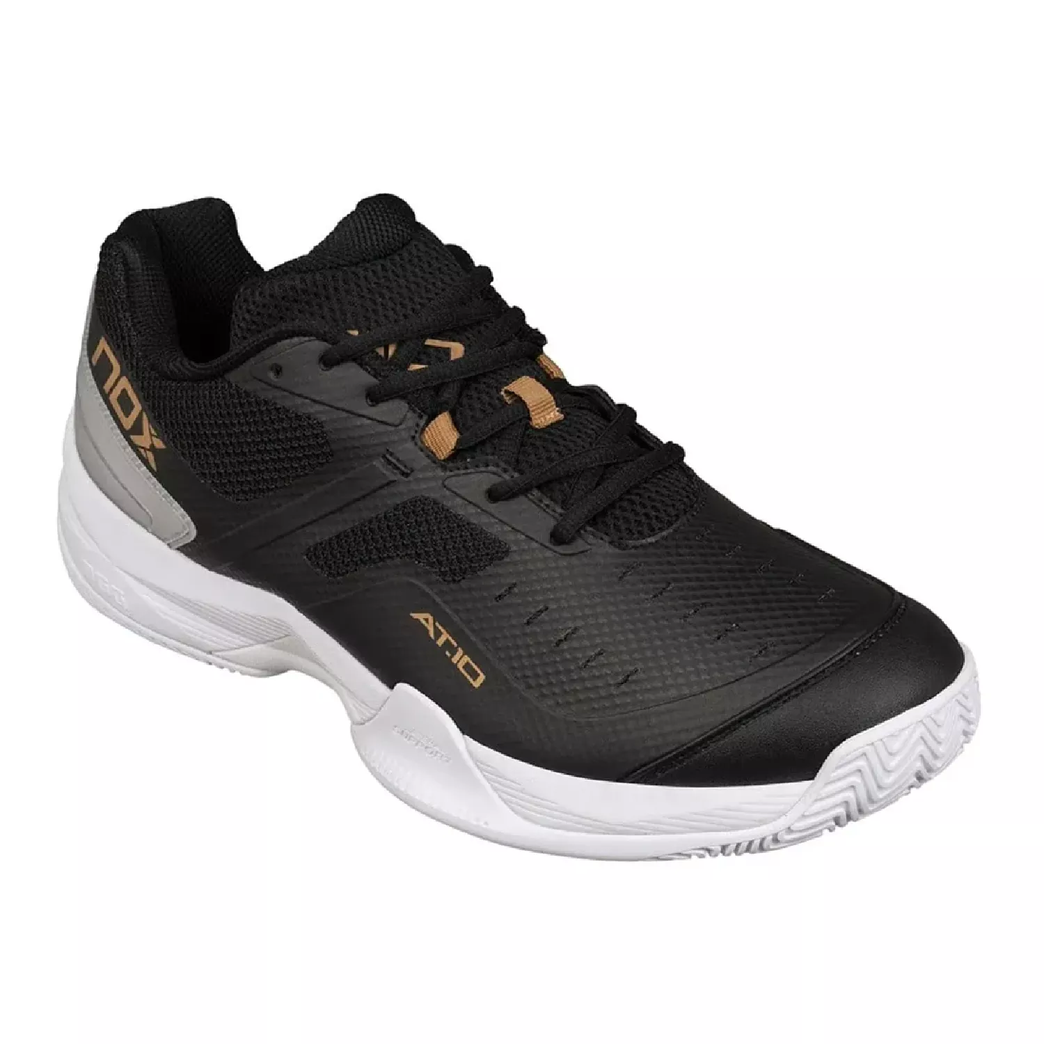 NOX Padel Shoes AT10 Pro Black Gold are engineered for players who demand professional performance with maximum stability and comfort. Featuring AGG technology for enhanced support, a Lateral Support system for quick movements, and optimal cushioning for shock absorption, these shoes provide everything you need to dominate the court. The durable outsole delivers excellent grip and traction, while the black-and-gold design adds a touch of elegance to high-level play.