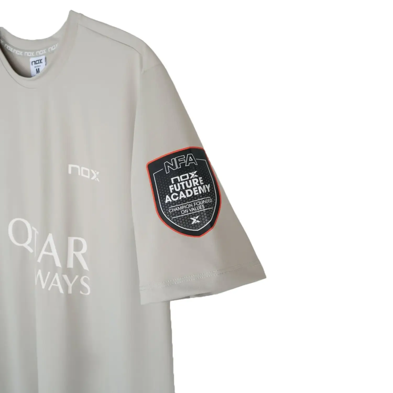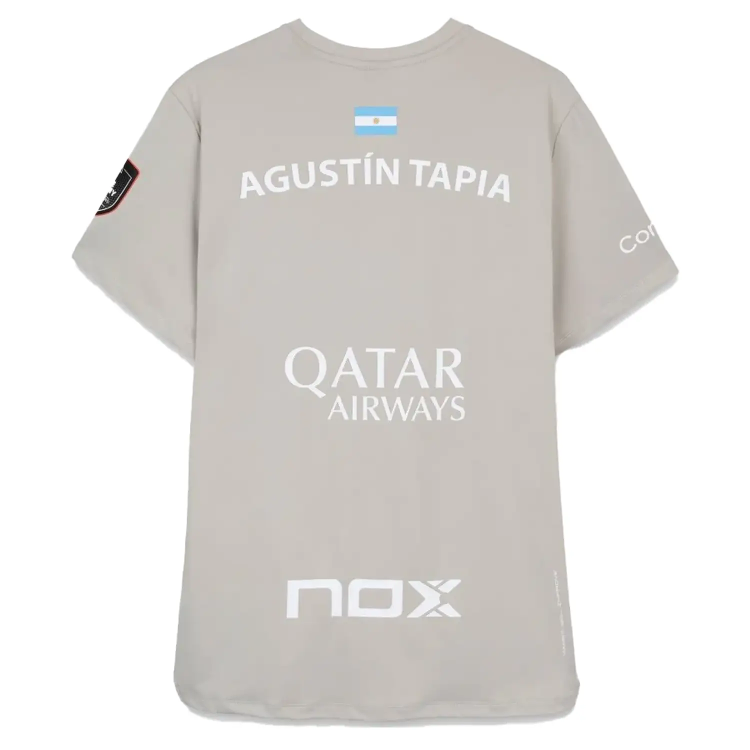 NOX Tshirt AT10 Agustin Tapia Sponsors Grey 2026 Edition delivers a refined balance between modern technical design and subtle on-court elegance. Inspired by the playing style of Agustín Tapia, known as the “Mozart of Catamarca,” this neutral grey version offers a clean, contemporary aesthetic without compromising competitive intensity. It features the full 2026 sponsor configuration, including Qatar Airways, Commvault, and Nox Future Academy, applied in high-density vinyl for sharp definition and long-lasting durability.