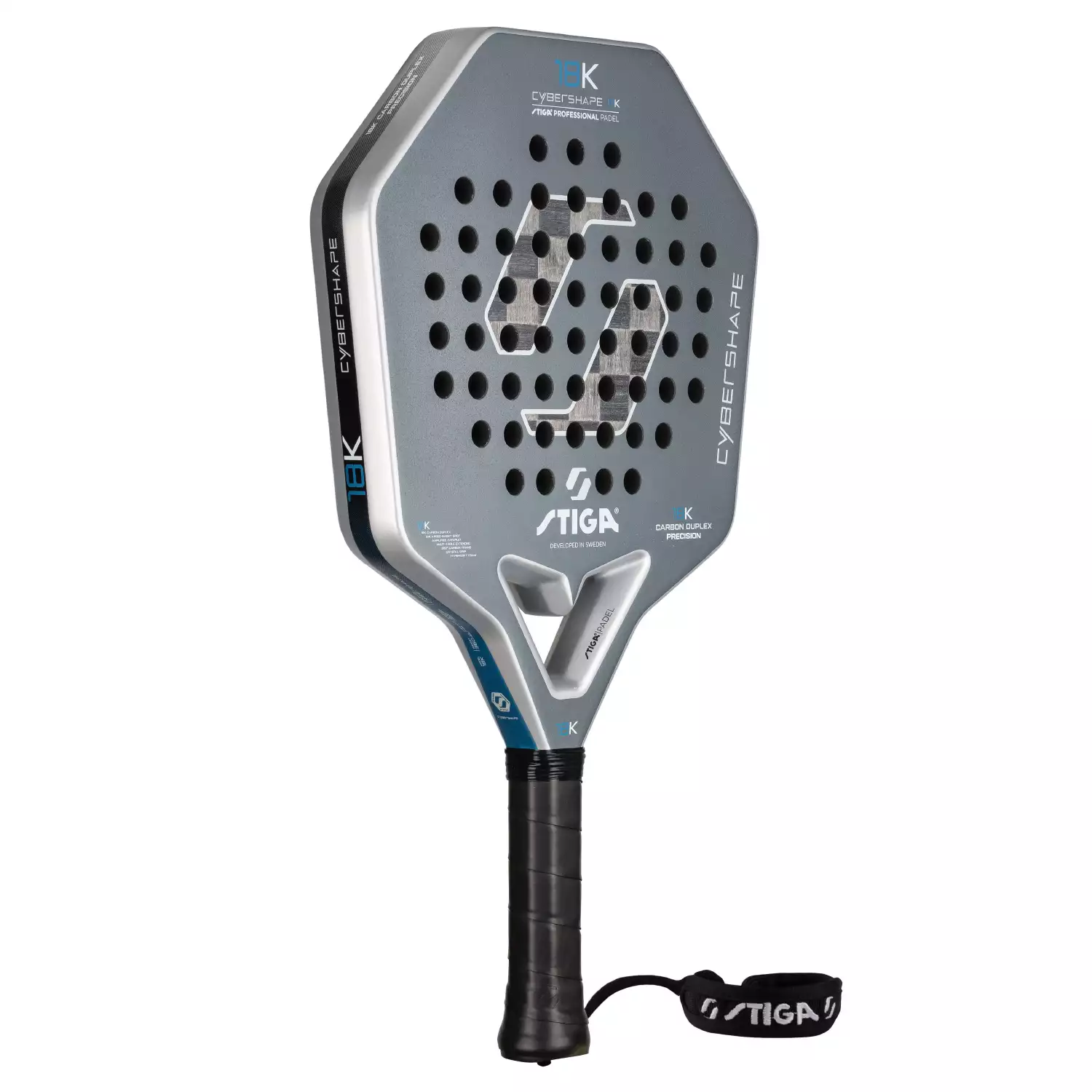 STIGA Padel Racket 18K 2 Cybershape 2026 Like the 18K Cybershape? Then we think you’ll love the 18K 2 Cybershape – same model, but in a new, fine-tuned design to make it even more balanced. This racket is somewhat softer than its twin, the 18K Hard, and offers fantastic control on ball contact with a softer ball impact. This means you can handle very difficult shots from tough angles. The reinforced carbon-fibre layer and the exclusive silver treatment bind the weave to give you a hitting surface that delivers finesse without sacrificing speed or precision. Quite simply the ideal racket for the control-orientated player!