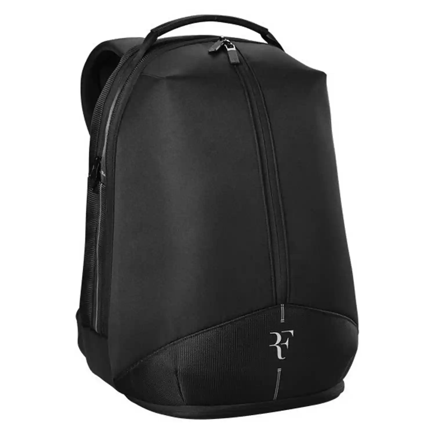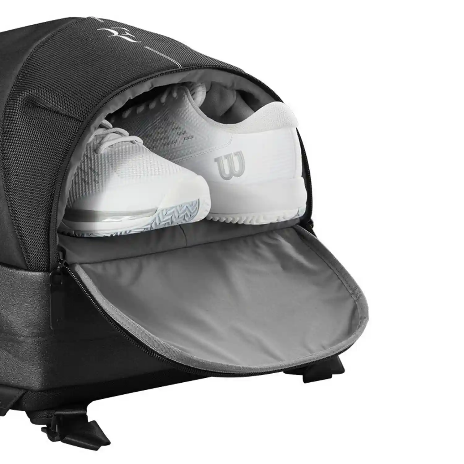Built for competitive players and frequent travelers, this Wilson tennis backpack features an ergonomic carrying system for enhanced comfort and stability. A separate bottom shoe compartment keeps footwear isolated from clean gear, while a dedicated laptop sleeve and multiple secure zippered pockets ensure safe and organized storage of valuables. The fleece-lined hidden top pocket protects delicate items such as phones or wallets, and the integrated travel strap allows easy attachment to hand luggage. Constructed with a durable blend of PU, polyester and nylon materials, this RF backpack delivers elite functionality, premium design and tournament-ready performance in a sleek black finish.